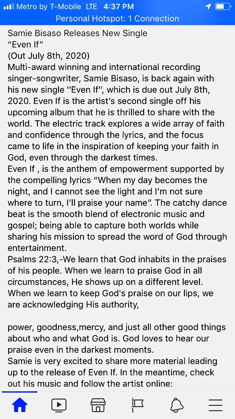 Samie Bisaso is a Multi Award Winning Artist, Singer, Songwriter, and Composer. His love for God, and his craft, which he has developed over the years, defines everything that he is today and inspires the music that he puts out! His vocal range, style and meaningful lyrics presented through his original sound have set a place in the music industry, and have created praise among listeners of all ages and creeds. His music is a powerful voice in uplifting, and represents a pure style of music rooted in faith.